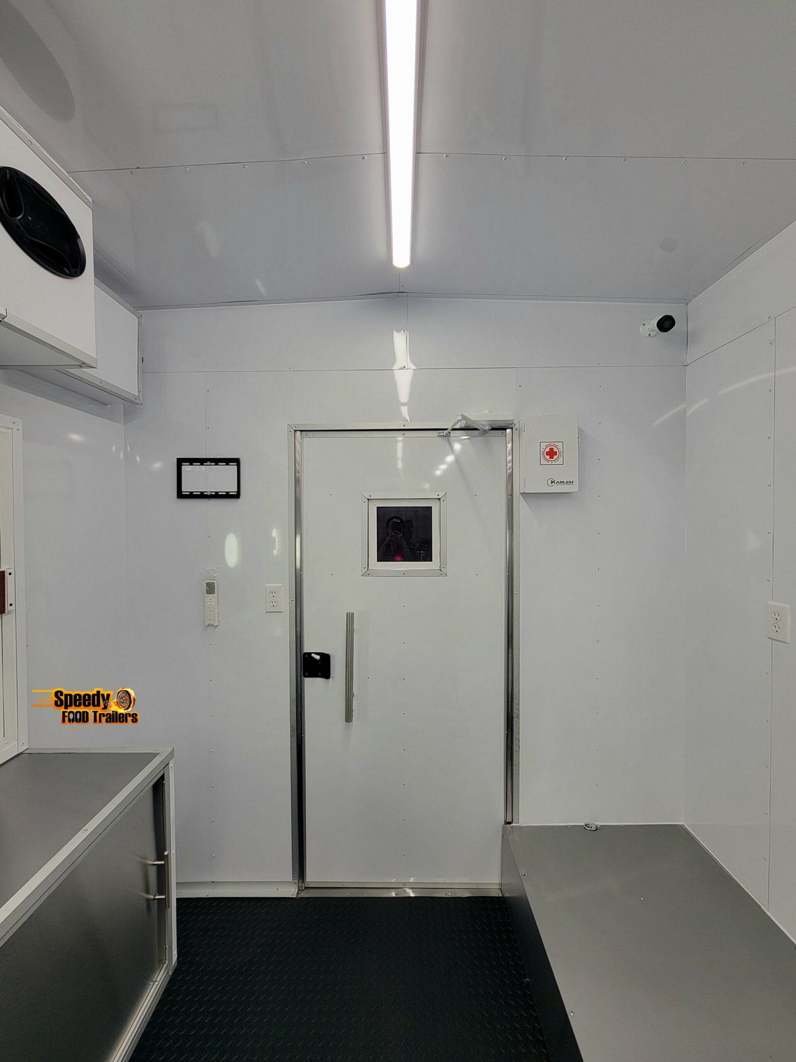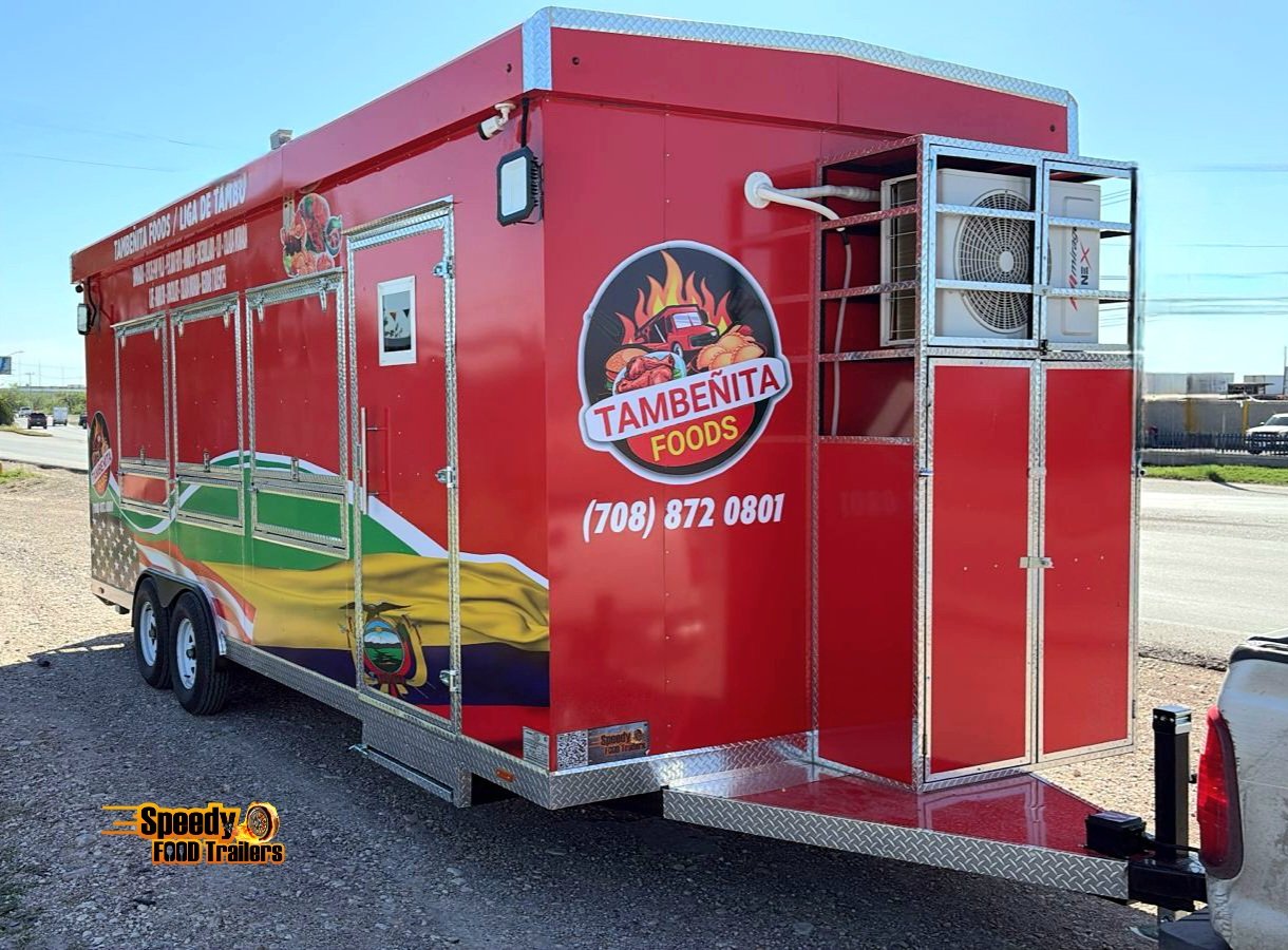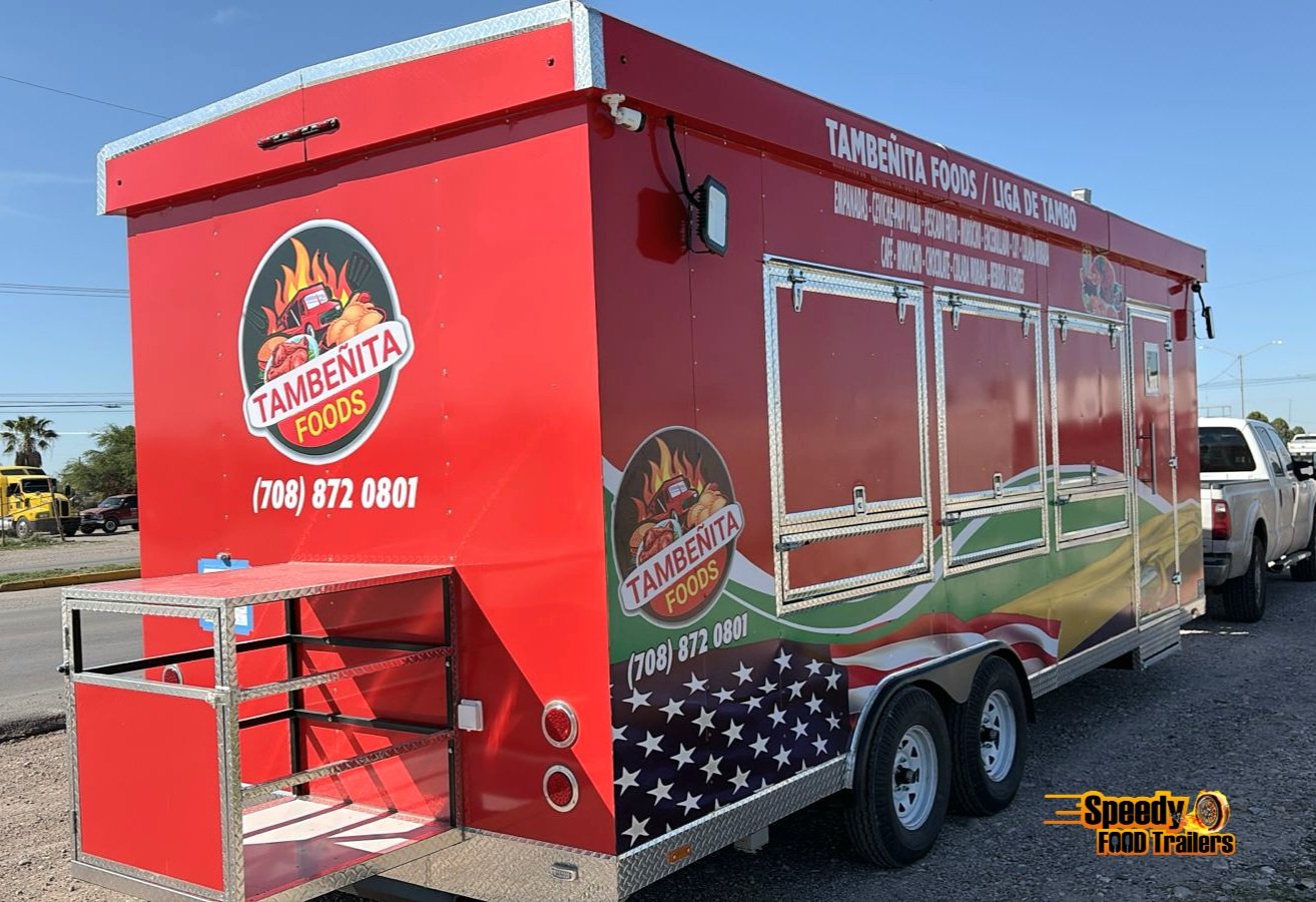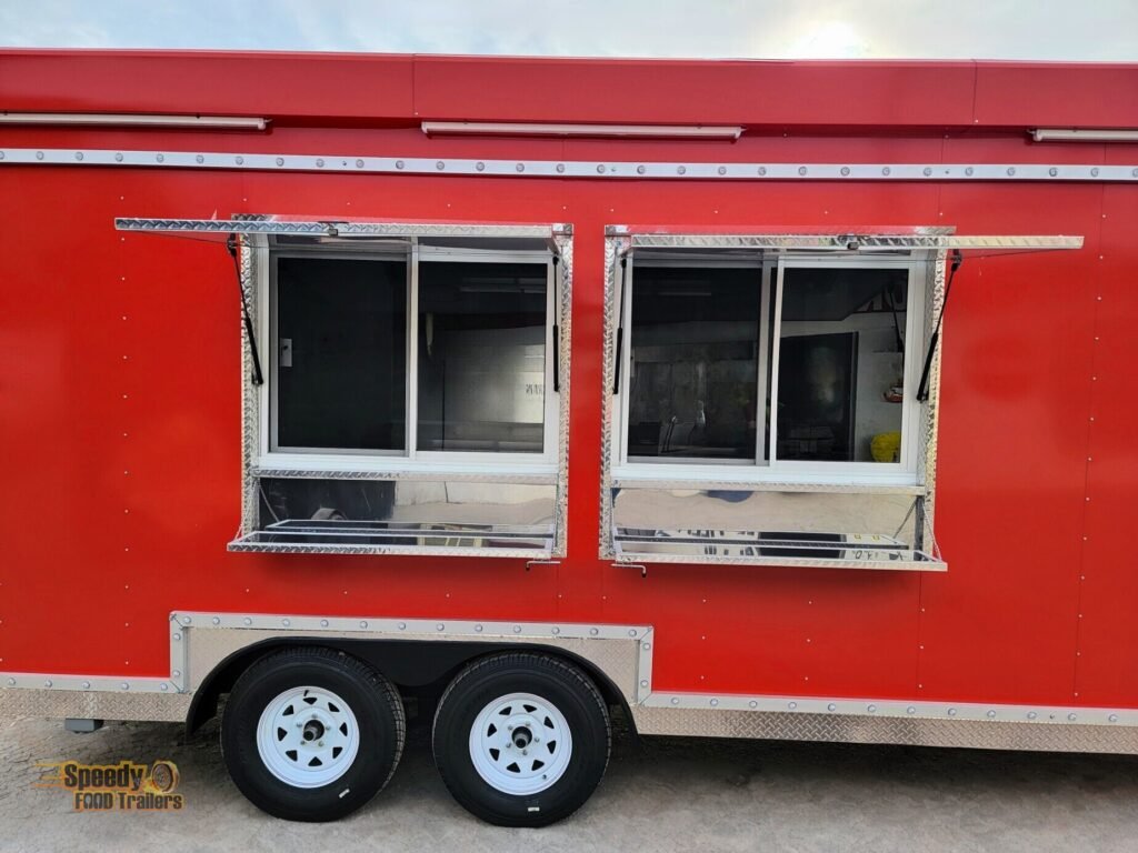 This 8.5x24 ft trailer comes super equipped and features a 6 ft covered porch with fold-down panels and fly net, perfect for outdoor cooking and serving. Designed for maximum comfort, efficiency, and style — ready to roll in Illinois!