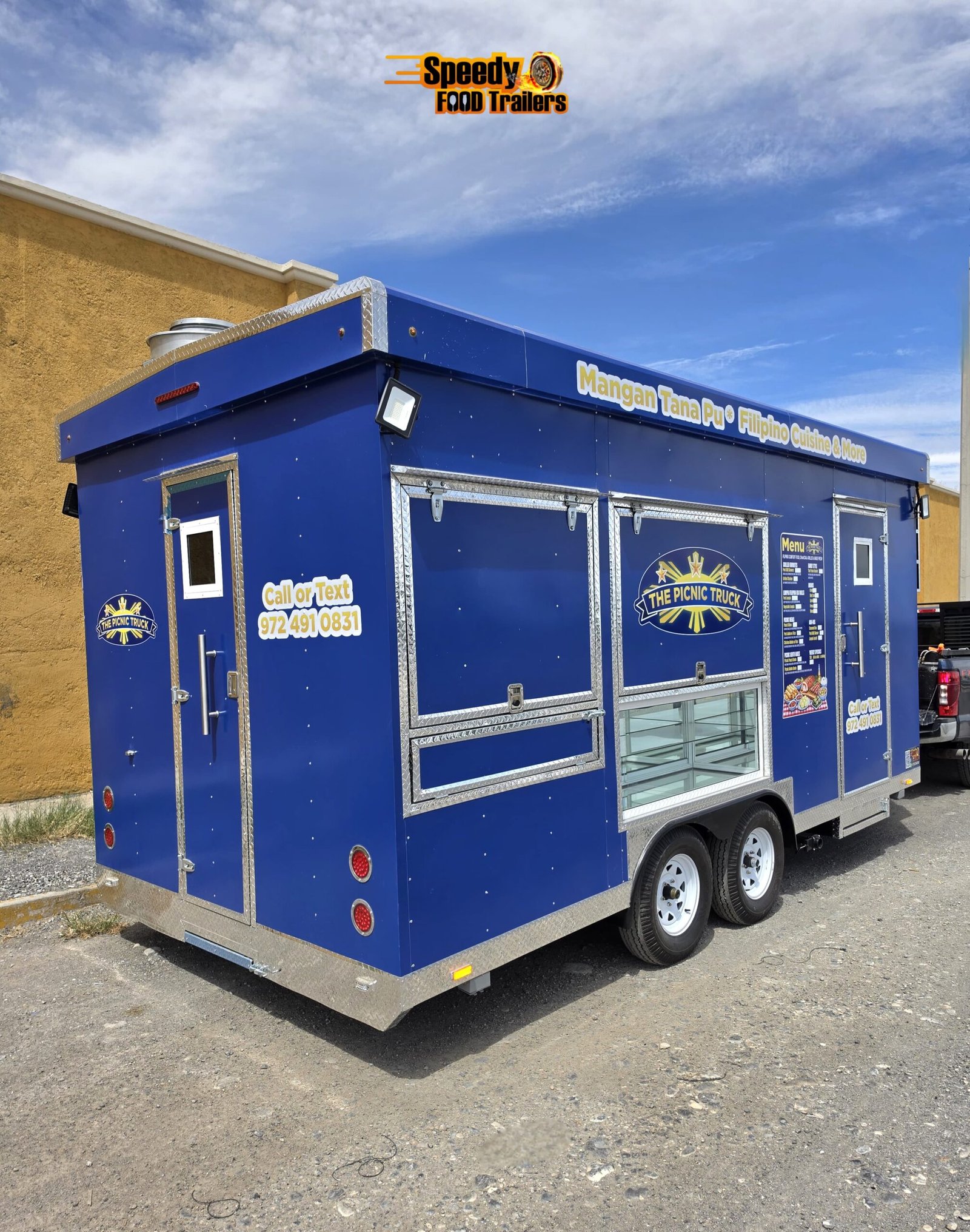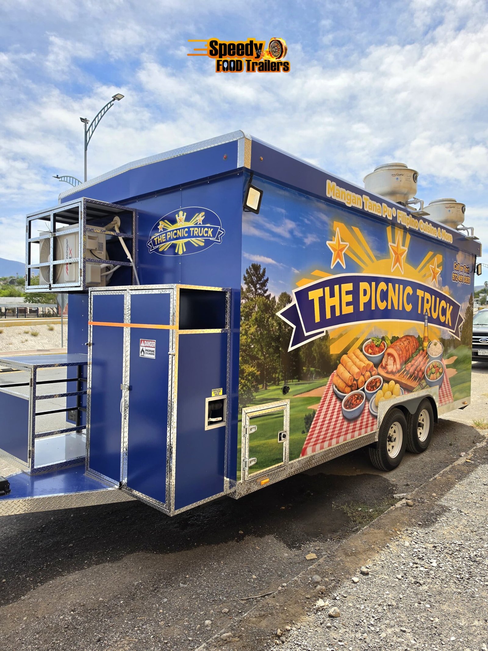 Custom built food trailer for Mangan Tana Pu Filipino Cuisine & More, designed to deliver performance, durability, and style. This 8.5 x 18 ft trailer features a 4 ft closed porch, providing additional enclosed space for storage or equipment, making it perfect for busy food operations.